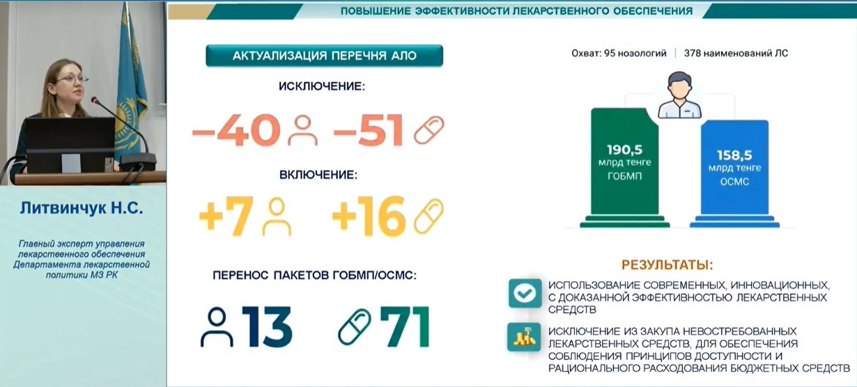 На круглом столе «Лекарственное обеспечение. Устойчивые процессы. Современные подходы», который прошел в Национальном центре экспертизы лекарственных средств и медицинских изделий главный эксперт управления лекарственного обеспечения Департамента лекарственной политики МЗ РК Наталья Сергеевна Литвинчук представила комплексный обзор реформ, меняющих модель лекарственного обеспечения в Казахстане. В центре внимания переход к цифровой, прозрачной и ориентированной на пациента системе.
