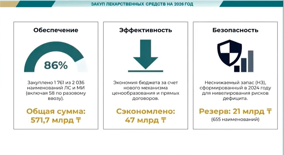 Параллельно была проведена оптимизация амбулаторного лекарственного обеспечения. Сегодня государство гарантирует лечение по 95 нозологиям с использованием 378 лекарственных средств. Финансирование остаётся значительным: порядка 190 млрд тенге выделено в рамках гарантированного объёма бесплатной медицинской помощи и ещё 158 млрд тенге  через систему обязательного социального медицинского страхования в 2026 году. Такая модель позволяет обеспечить стабильность поставок и контроль качества терапии.