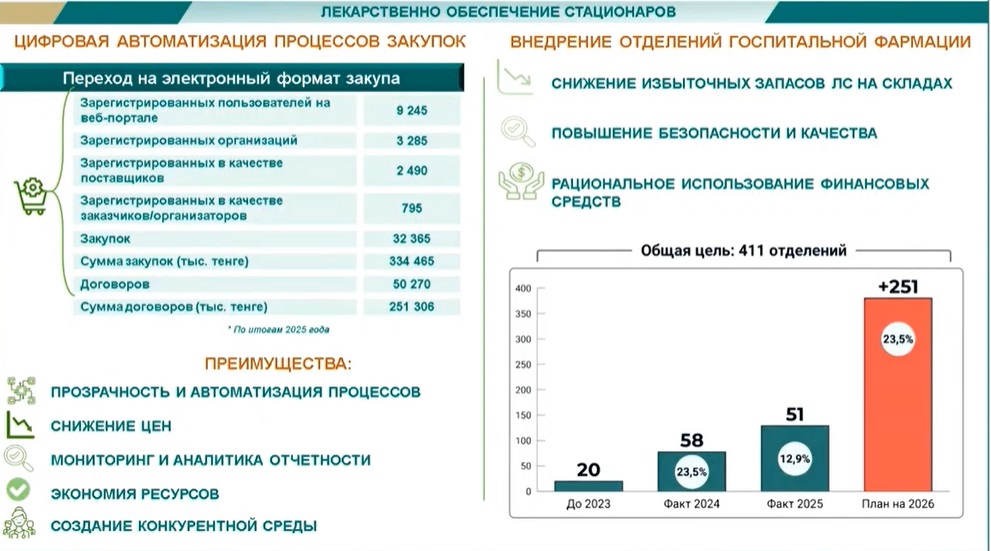 Значительный потенциал эффективности демонстрирует и развитие госпитальной фармации. На сегодняшний день в медицинских организациях уже открыто 129 профильных отделений, а к концу 2026 года их число планируется увеличить до 441. Практика, активно внедрённая, в частности, в Астане, показала до 46% относительной экономии ресурсов.