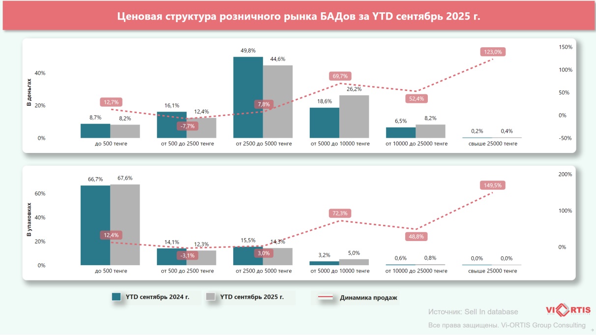 Самые высокие темпы роста показывают премиальные БАД стоимостью свыше 25 тысяч тенге: более 123% в деньгах и 149% в упаковках. Это говорит о расширении аудитории, готовой инвестировать в высокосегментные продукты здоровья.