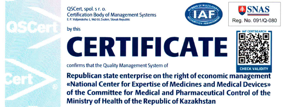 Национальный центр экспертизы лекарственных средств и медицинских изделий успешно прошёл повторную сертификацию системы менеджмента качества на соответствие требованиям международного стандарта ISO 9001:2015. Сертификат